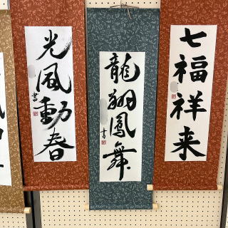 | 食堂周辺が展示会場となりました。 以下,展示物一覧 1年生…書道作品・トートバック 2年生…錫の立体 3年生…風景画・紙粘土で想像の生物・絵本 4年生…掛け軸・絵画・紙粘土でキャラクター 5年生…わくわくクッキング |