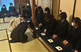 | 3組4組の生徒は,2月1日(木)に訪問させていただきました。 もてなす側(クラス)ともてなされる側(クラス)に分かれて作法を学びました。所作の一つひとつの意味を,丁寧に教えていただきました。 |
